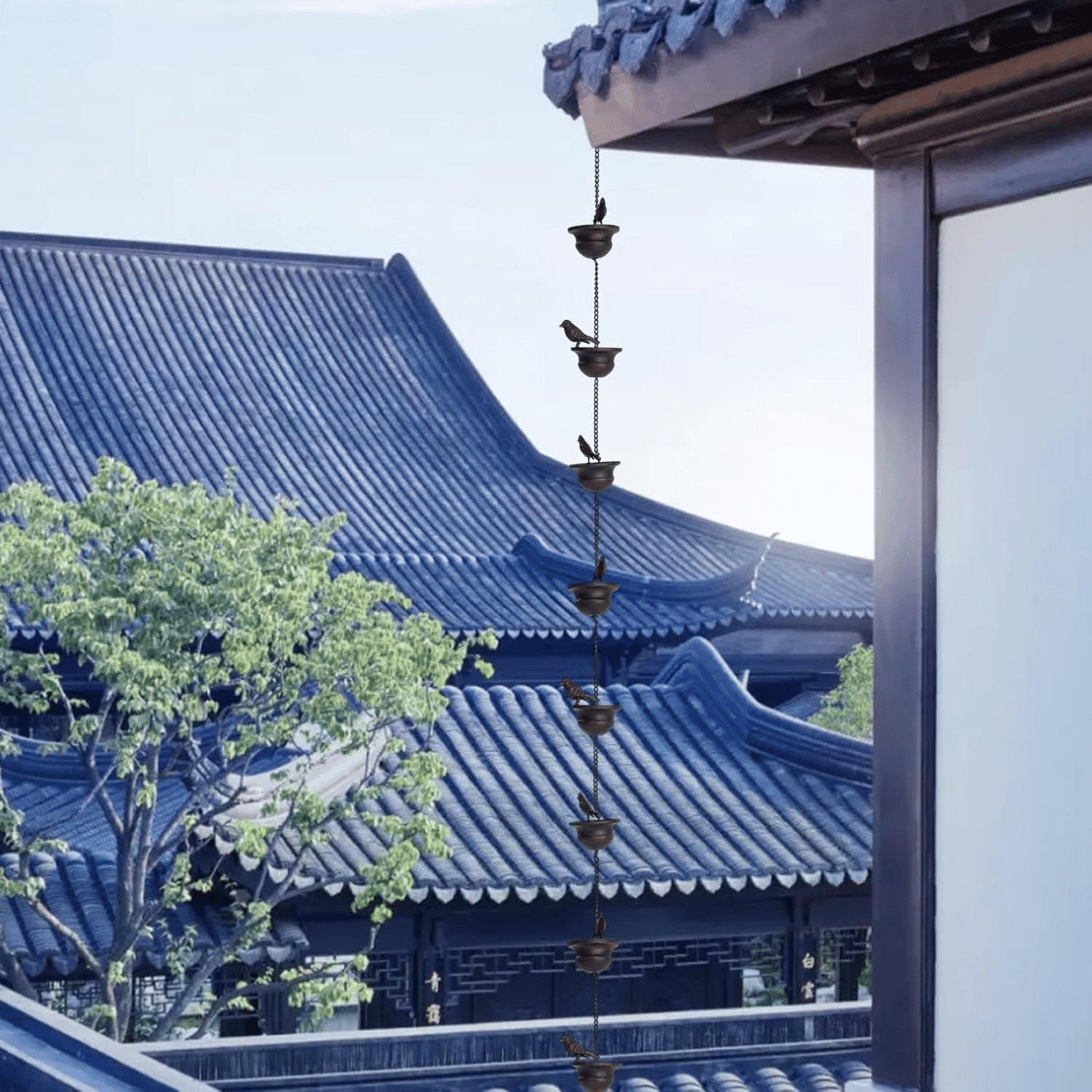 Deze trapsgewijze regenketting is een prachtig alternatief voor traditionele regenpijpen. Regenwater stroomt sierlijk van het ene vogelbad naar het andere, waardoor een natuurlijk watervaleffect ontstaat dat zowel visueel als auditief rustgevend is.